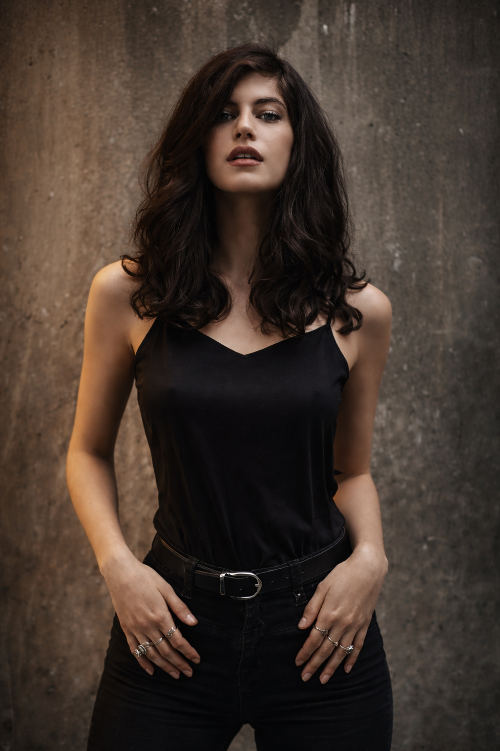 The setting does a lot of the talking. Wood, concrete, metal textures that feel grounded, almost heavy. They don’t compete; they anchor. The lines of the stairs, the repetition of the railings, the emptiness of the floor they all frame her without forcing it. I didn’t want to overcomplicate anything here. Black on black. Minimal distractions. Let the shape, posture, and expression carry the weight.